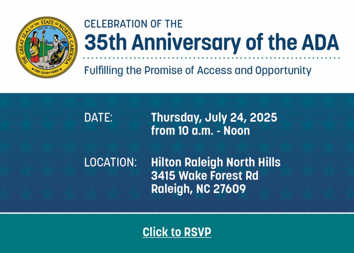 The location of the NCDHHS Celebration of the 35th Anniversary of the Americans with Disabilities Act has been changed to Hilton Raleigh North Hills, located at 3415 Wake Forest Road in Raleigh. It will be held on Thursday, July 24, 2025, 10:00-12:00 p.m. Reserve your seat.