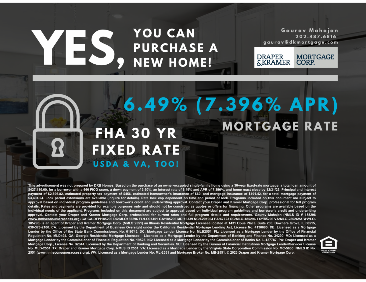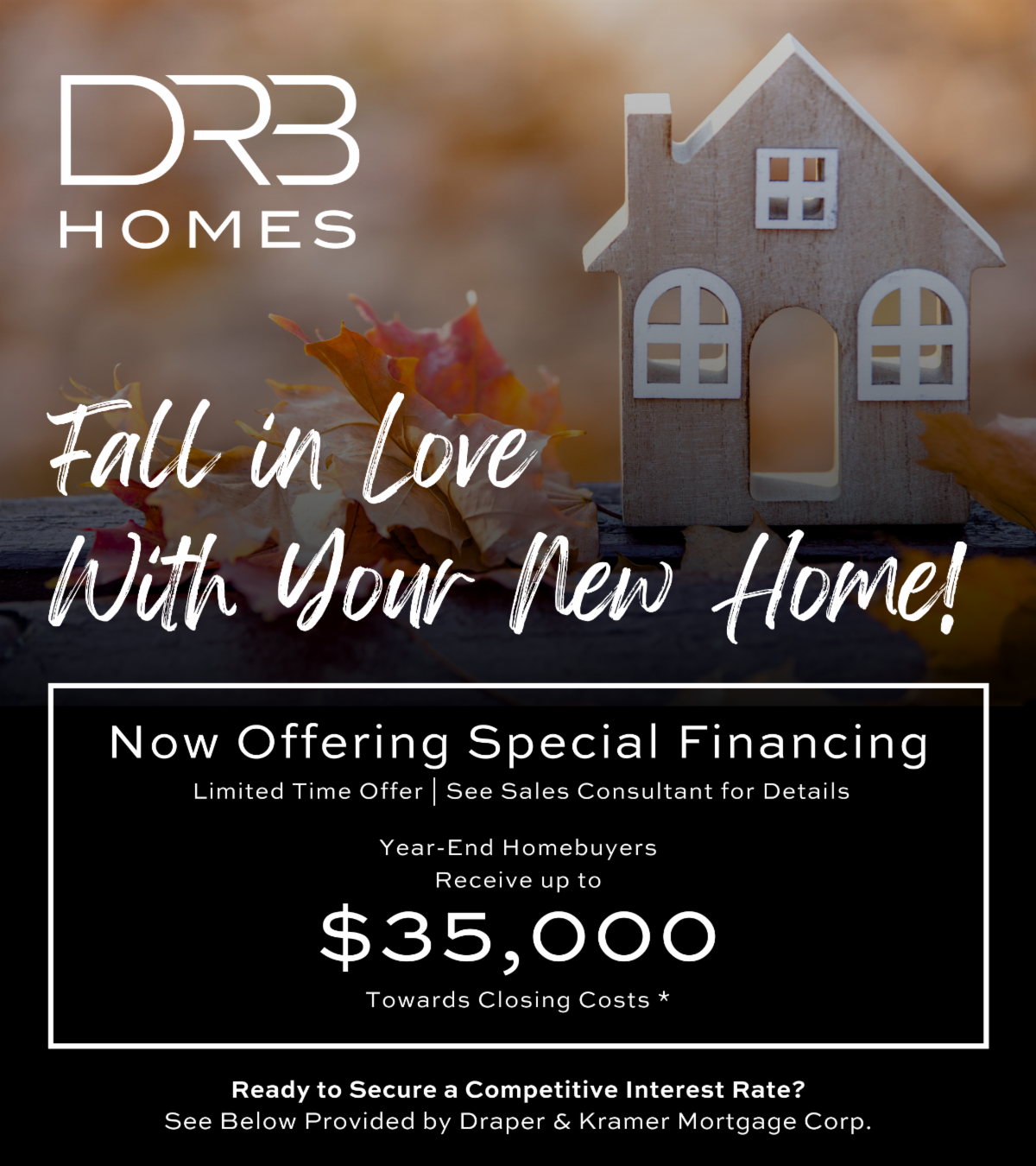 | Home and community information, including, without limitation, pricing, included features, terms, conditions, and availability subject to change without notice. All images are offered as depictions only and individual homes, amenities, features, and views may differ. DRB Group Mid-Atlantic, LLC (MHBR# 7041) [(each d/b/a DRB Homes and DRB Elevate)] are collectively referred to below as “DRB Homes”. *Up to $35,000 in closing cost assistance incentive (“Incentive”) available only for new contracts executed with DRB Homes between November 03, 2023 and December 29, 2023 for the purchase any of DRB Homes’ inventory or to-be-built in a [(each such contract being a “Qualifying Contract”]). Limit one (1) Incentive per Qualifying Contract. The maximum value of the Incentive varies by Qualifying Subdivision as described below but in no event shall exceed the actual closing costs incurred by the homebuyer; the stated maximum value of the Incentive in this advertisement (i.e., up to $35,000) is based upon the following Qualifying Subdivisions: Hammaker Hills (Thurmont, MD), Westphalia Town Center (Upper Marlboro, MD), and Westridge (Upper Marlboro, MD). Home availability subject to change without notice. In order to receive the Incentive (i) the homebuyers must present this advertisement to DRB Homes prior to executing a Qualifying Contract; (ii) an Approved Lender and Approved Settlement Agent of DRB Homes (each as identified/defined in the Qualifying Contract) must be used by the homebuyers; and (iii) Settlement (as defined by the Qualifying Contract) of the purchase of the Property (as defined by the Qualifying Contract) must be completed in accordance with the terms of the Qualifying Contract, without any homebuyer default thereunder, on or before December 29, 2023. Without limiting the above conditions to the receipt of the Incentive, YOU ARE UNDER NO OBLIGATION TO SELECT ANY OF DRB HOMES’ APPROVED LENDER(S) OR APPROVED SETTLEMENT AGENT(S) AS YOUR LENDER OR SETTLEMENT AGENT. The Incentive represents credit(s) from DRB Homes up to the maximum value of the Incentive (which varies by Qualifying Subdivision as described below). All closing cost credit(s) are subject to additional terms and restrictions placed by DRB Homes’ Approved Lender(s) and/or applicable law, and DRB Homes makes no guarantee that any closing costs credits by DRB Homes may be received by a homebuyer. Additional limitations apply. See a DRB Homes sales consultant for additional details. The Incentive may not be combined with any other offer, promotion, or incentive. The Incentive is non-transferrable, non-assignable, non-exchangeable, and cannot be redeemed for cash. DRB Homes may, in its sole discretion, and without prior notice, modify or discontinue the Incentive at any time. As used herein, “Qualifying Subdivision” shall mean and refer to individually to each of the following subdivisions: (a) Hammaker Hills (Thurmont, MD), Westphalia Town Center (Upper Marlboro, MD), and Westridge at Westphalia (Upper Marlboro, MD) [(the maximum value of the Incentive with respect to each of the foregoing subdivisions enumerated in this subpart (a) is up to $35,000)]; and (b) The Village at Cabin Branch (Clarksburg, MD), Woodbourne Manor (Jefferson, MD), and Tinkers Preserve (Clinton, MD) [(the maximum value of the Incentive with respect to each of the foregoing subdivisions enumerated in this subpart (b) is up to $30,000)]. The Village at Cabin Branch (Clarksburg, MD) subdivision identified above is intended to provide housing primarily for persons fifty-five (55) years of age or older and are operated as an age-restricted community in compliance with all applicable state and federal laws. At all times, at least eighty percent (80%) of the homes within the Village at Cabin Branch (Clarksburg, MD) subdivision must be occupied by at least one (1) individual fifty-five (55) years of age or older. This advertisement shall not constitute an offer or solicitation in any state where prior registration is required. The following disclosure is made in accordance with §10-710 of the Real Property Article of the Maryland Code: (1) In Prince George’s County, a contract of sale for residential real property that includes an agreement by the home builder to provide a community amenity shall include a disclosure statement that: (I) Identifies the community amenity provided in the contract of sale, and (II) Specifies when the community amenity will be completed in accordance with a recreational facilities agreement recorded with the Prince George’s County Planning Department; (2) The disclosure statement required under the foregoing subpart (1) shall be: (A) Dated and signed by the purchaser and the home builder; and (B) Included in or attached to the contract of sale; and (3) A purchaser who does not receive the disclosure statement required under the foregoing subpart (1) on or before entering into the contract of sale has an unconditional right, on written notice to the home builder, to rescind the contract of sale at any time: (X) Before the receipt of the disclosure statement; or (Y) Within 5 days after receipt of the disclosure statement). | | | | | |