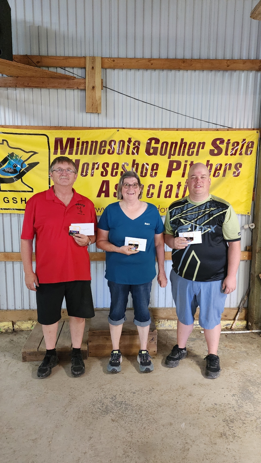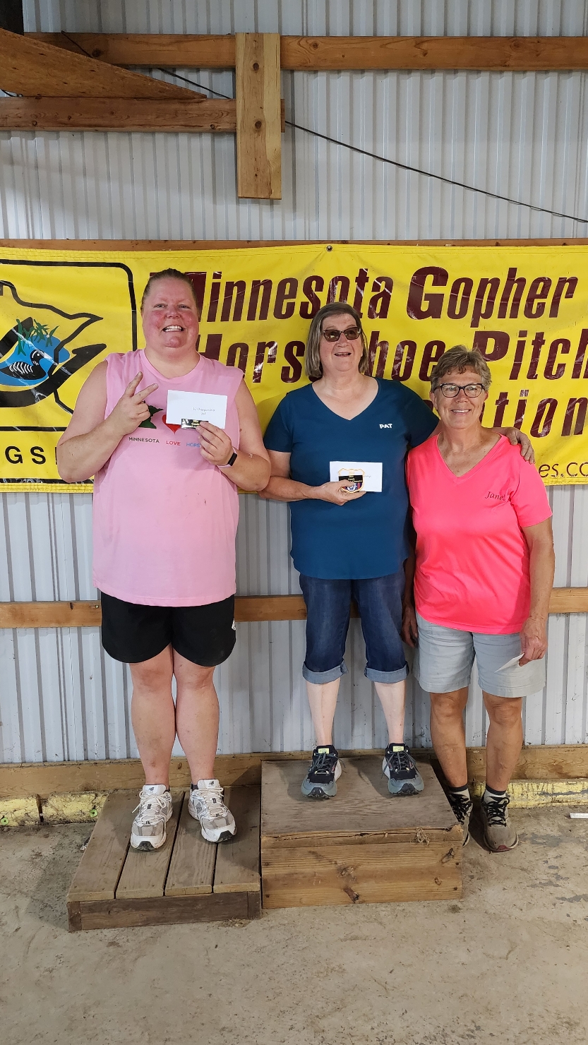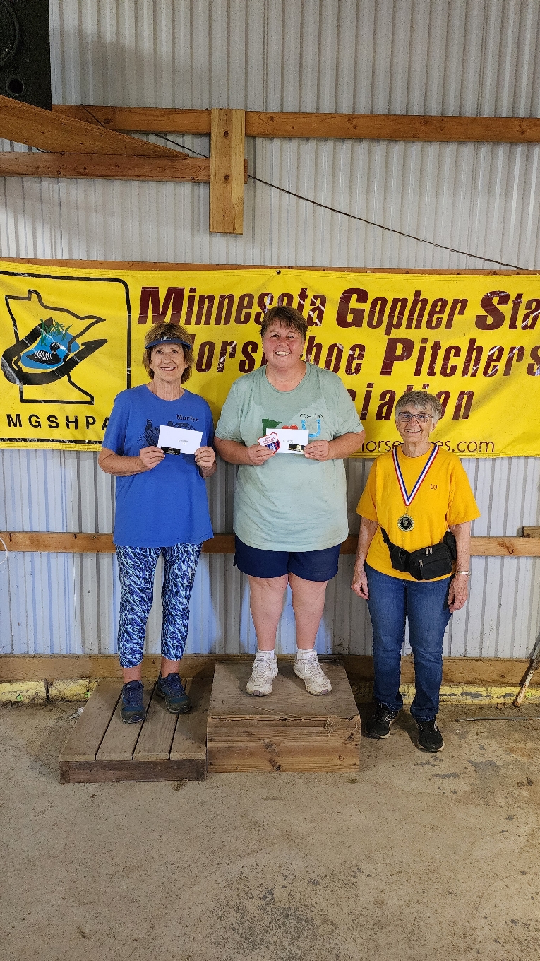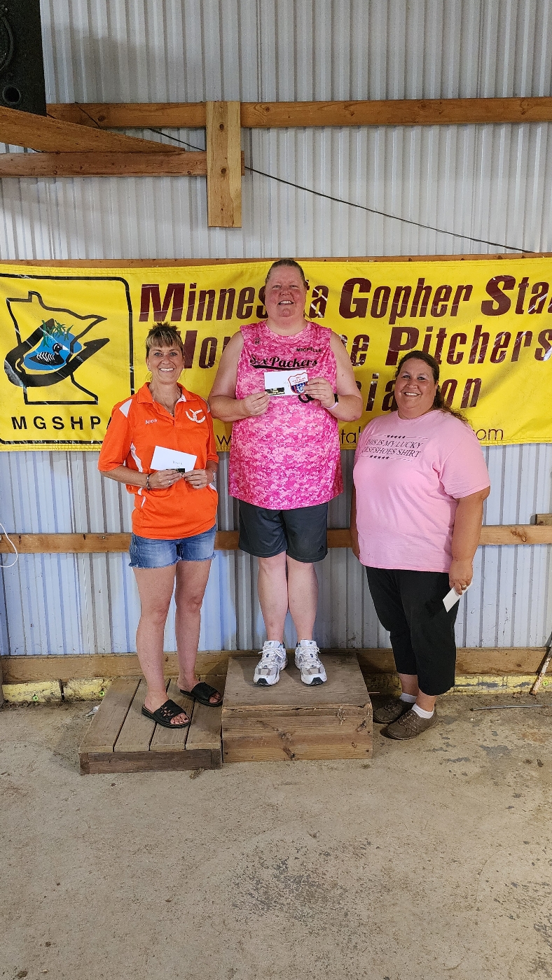 A small, but mighty class as Lu Cave, Marlys Timm and I took to the courts, with our designated pacer, Tristian Dehkes. (Thank you Tristian!) We played a double Round Robin and the competition was fierce. Playing against these two women who have been so influential in Minnesota Horseshoes was an honor. They have been mentors and roll models to so many young women.