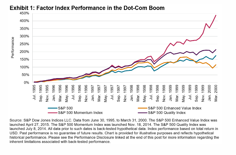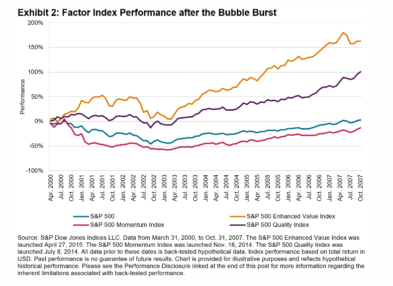 Standard & Poor's recently published some research comparing the performance of different types of companies before and after the 2000 market peak. Momentum Stocks dramatically outperformed High Quality and Value Stocks in the run up to the market peak of 2000. These were companies like Cisco, Microsoft, Lucent, and Intel.