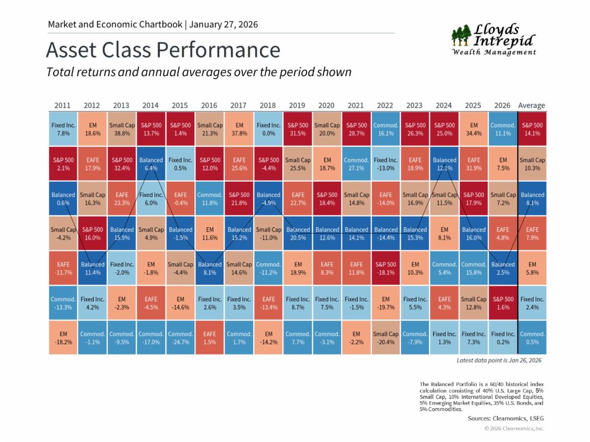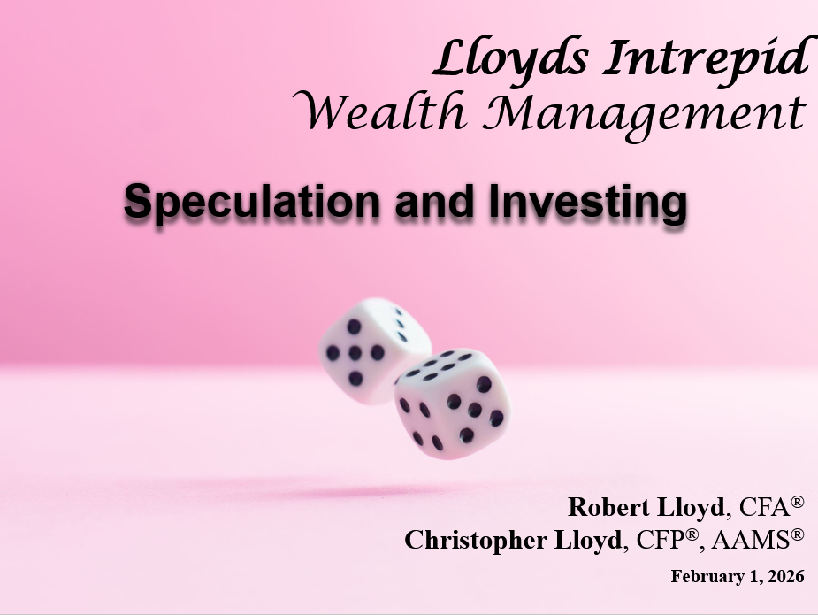 | Lloyds Intrepid LLC is an Investment Advisor registered with the State of Texas, where it is doing business as Lloyds Intrepid Wealth Management. All views, expressions, and opinions included in this communication are subject to change. This communication is not intended as an offer or solicitation to buy, hold or sell any financial instrument or investment advisory services. Any information provided has been obtained from sources considered reliable, but we do not guarantee the accuracy, or the completeness of, any description of securities, markets or developments mentioned. We may, from time to time, have a position in the securities mentioned and may execute transactions that may not be consistent with this communication's conclusions. Please contact us at 281.886.3039 if there is any change in your financial situation, needs, goals or objectives, or if you wish to initiate any restrictions on the management of the account or modify existing restrictions. Additionally, we recommend you compare any account reports from Lloyds Intrepid LLC with the account statements from your Custodian. Please notify us if you do not receive statements from your Custodian on at least a quarterly basis. Our current disclosure brochure, Form ADV Part 2, is available for your review upon request, and on our website, www.LloydsIntrepid.com. This disclosure brochure, or a summary of material changes made, is also provided to our clients on an annual basis. | | | | |