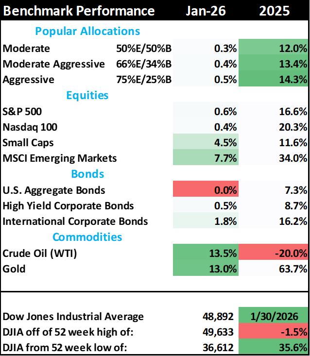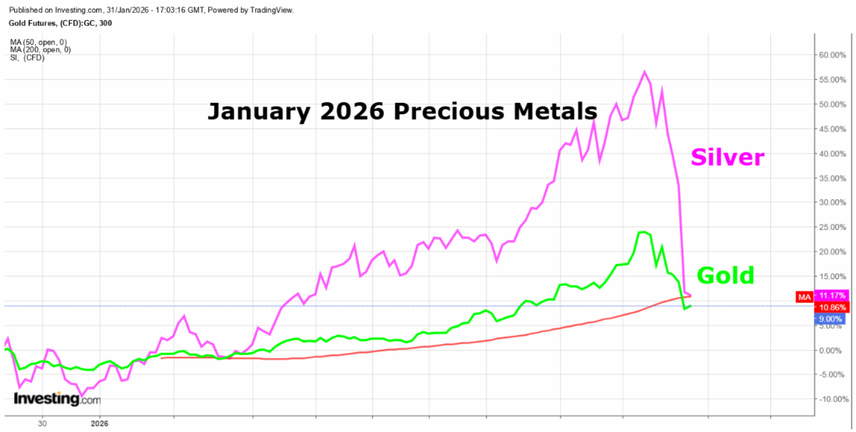 With silver up 20% in January and gold rising 12%, this month's note will discuss precious metals, speculation and investing. Silver was up 70% December 31 through January 29th but fell 30% on the last day of the month, January 30th. Because percentage math is not intuitive, remember that even with the last day losses, silver is up 20% from 2025.
