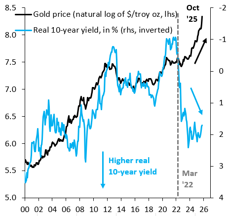Figure 4: Gold appreciation compared to Federal Reserve interest rate policy 2000-2025 (Longtermtrends.com)
