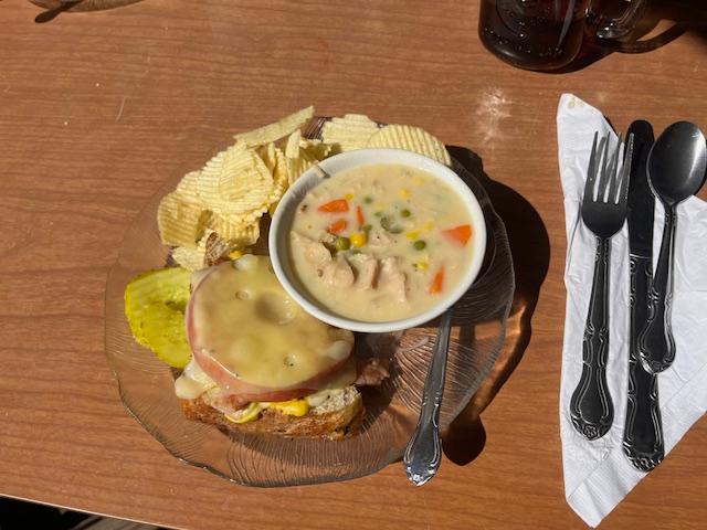 Their menu features daily soup specials with a rotating selection of sides and desserts which have never disappointed. I especially like their half sandwich and cup of soup lunch special, which to me is the perfect amount of food. Most of their sandwiches can be served on your choice of homemade bread or panini. I’m a huge fan of their tuna melt which comes with tomato and Swiss cheese, but on my recent visit I decided to try their signature open-faced grilled apple sandwich. This beauty was served on fresh baked eight-grain bread topped with sliced apples, mustard, mayo, ham, and Swiss cheese and then grilled until the cheese was perfectly melted and the apples were warm.