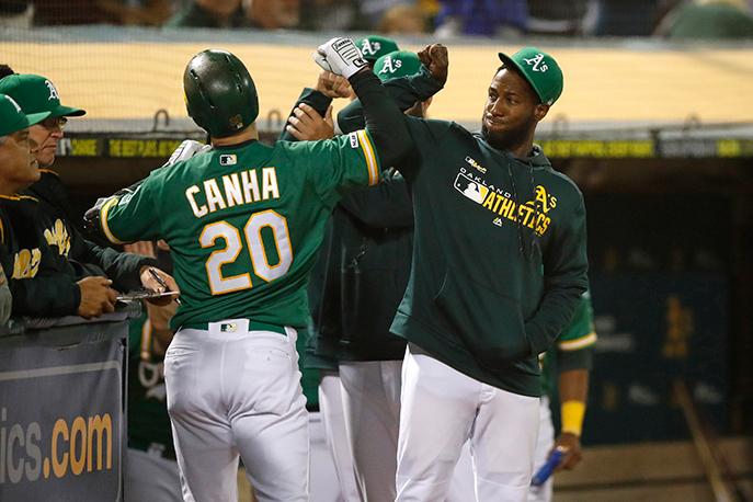 Center fielder Mark Canha is congratulated by Jurickson Profar after hitting a home run in the 5th inning. Canha has 18 home runs on the season.