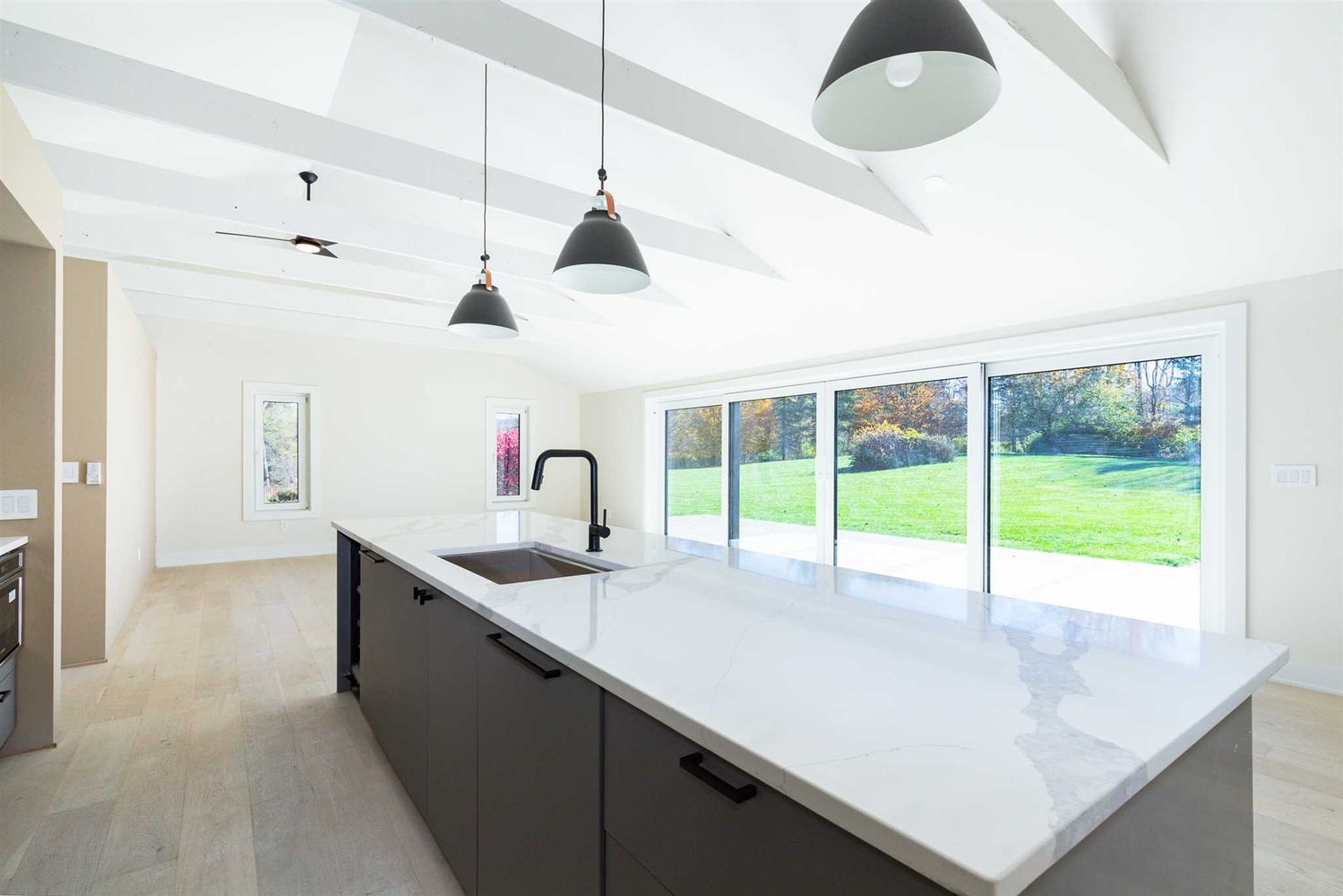 The light-filled three bedroom home has a large open living / dining / kitchen / great room with a cathedral ceiling that opens through 20' German lift-and-slide doors to a large deck and south facing lawn.