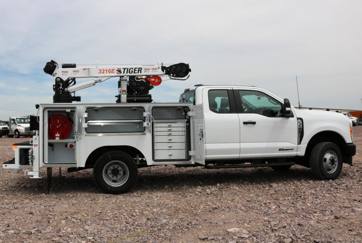 Built to match best with 9-foot bodies, the 3216E/EP Electric Tiger Crane offers up to 3,200 pounds of lift and up to 16.5-foot reach. The boom extends hydraulically from 7’8" to 11’8”, then manually out to 16’5”.