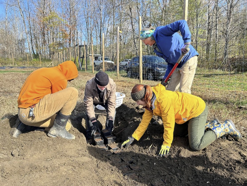 UVLT Launches Native Tree Nursery Project | | Alexander van Engelen, Dan Jones from ACF, Cassie Bernyk, and UVLT volunteer Lisa Solbert-Sheldon planting chestnuts at the Brookmead Garden. | | On a recent crisp fall day, UVLT took a significant step in our habitat restoration efforts by potting over 50 pure American chestnut seeds at the Brookmead Conservation Area in Norwich, VT, with help from volunteers and the NH/VT chapter of the American Chestnut Foundation. These seedlings will be transplanted in the spring on UVLT properties as part of a new native tree conservation nursery initiative. | | |