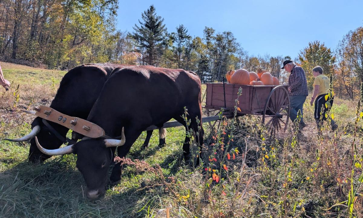 Pumpkin Picking at Old Town Farm | | Fall is always a busy season for farmers across the Upper Valley, and in Pomfret, VT, Neil and Alice Lamson are no exception. Each year, the Lamsons grow a beautiful crop of pumpkins in a field they lease from UVLT. But in recent years, harvesting the pumpkins had become a major undertaking — and UVLT's amazing volunteers and community members came together to lend a hand. With teamwork, laughter, and a bit of extra muscle from Neil’s oxen, the entire field was cleared in just two hours on a sunny Saturday — a task that once took days. | | |
