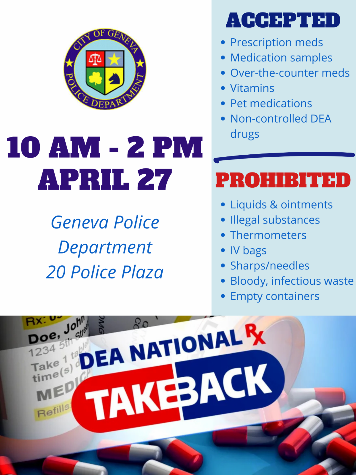 The service is free and anonymous, no questions asked. After 2 p.m. April 27, the Police Department will revert to its current practice of accepting unused medication from only Geneva residents. | | |