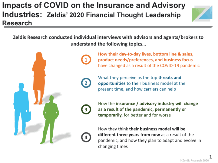 The impact of COVID on insurance agents, brokers and financial advisors was the subject of new qualitative thought research conducted by Zeldis Research last fall. Highlights include these professionals’ responses to the challenges of COVID, and how they foresee their industries changing as a result of recent disruptions. View the Key Takeaways HERE and view the webinar presentation of the findings HERE.