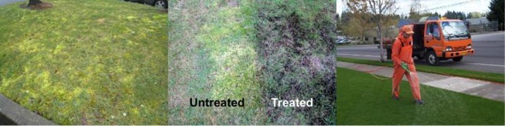 We will be treating for moss during April and early May, and you will see your lawn darken and parts even turn black as the moss dies. Don't be alarmed, this is normal and does not harm the lawn. It actually helps darken the lawn color while killing the moss.