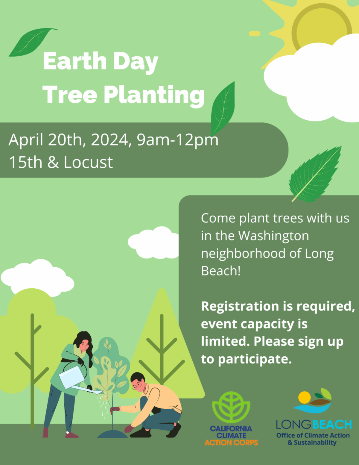 Celebrate Earth Day with our California Climate Action Corps fellows by planting 40 trees in the Washington neighborhood of Long Beach! Join us at the corner of 15th and Locust on April 20th from 9:00 am - 12:00 pm to learn about the benefits of street trees and work together to plant a few yourself. Registration is required for this event as capacity is limited.