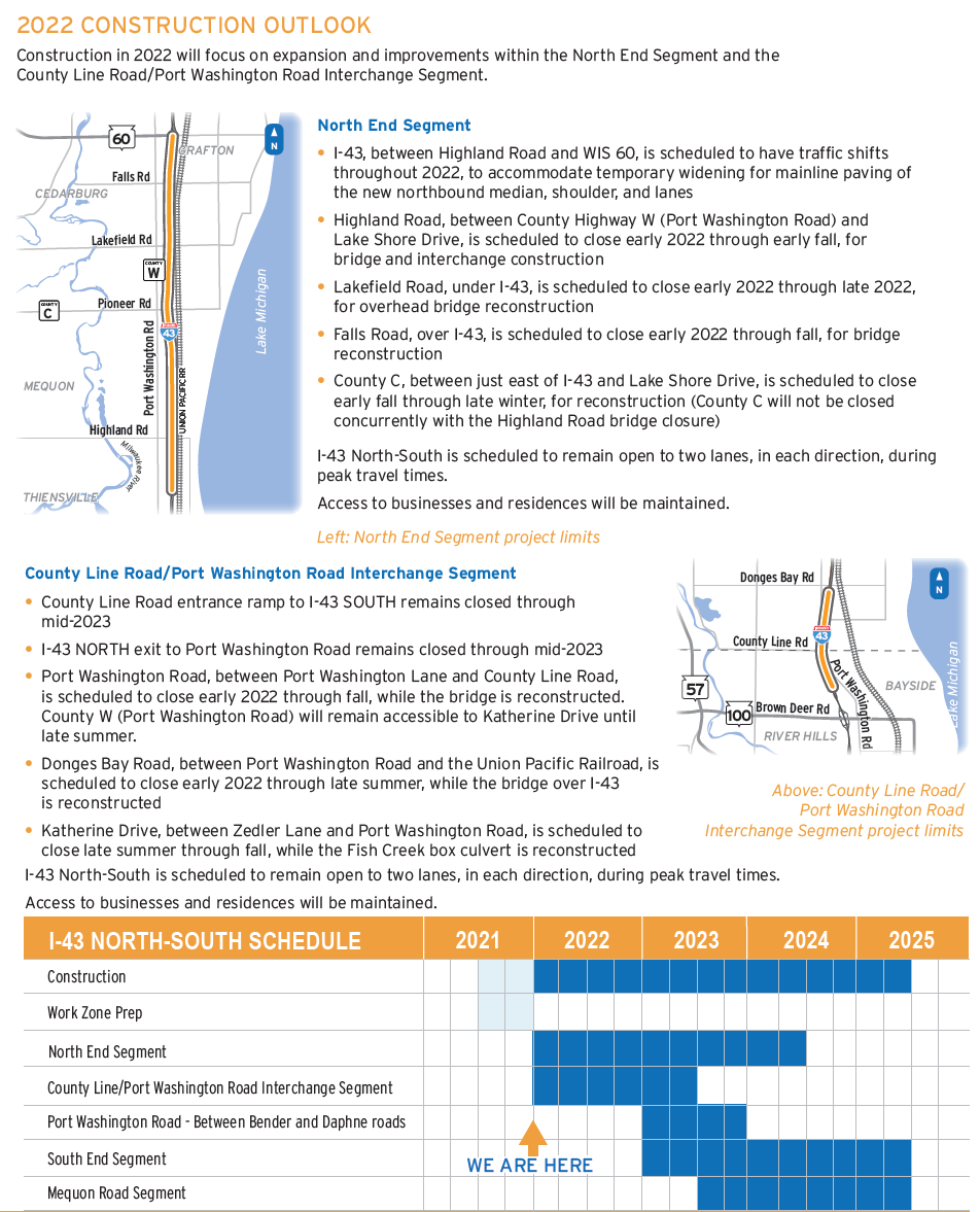 The I-43 North-South Freeway is among the busiest routes in Wisconsin and is a critical Interstate link between southeast Wisconsin and the entire state. I-43 provides access to manufacturers, merchants, commuters, and tourists within southeast Wisconsin, the Milwaukee metropolitan area, and other areas including Green Bay, Sheboygan, Manitowoc and Chicago. WisDOT has maintained and rehabilitated the ramps, bridges, pavements, and other structures on I-43 for 50 years. The North-South Freeway has exceeded its design life and it is no longer economical to maintain.