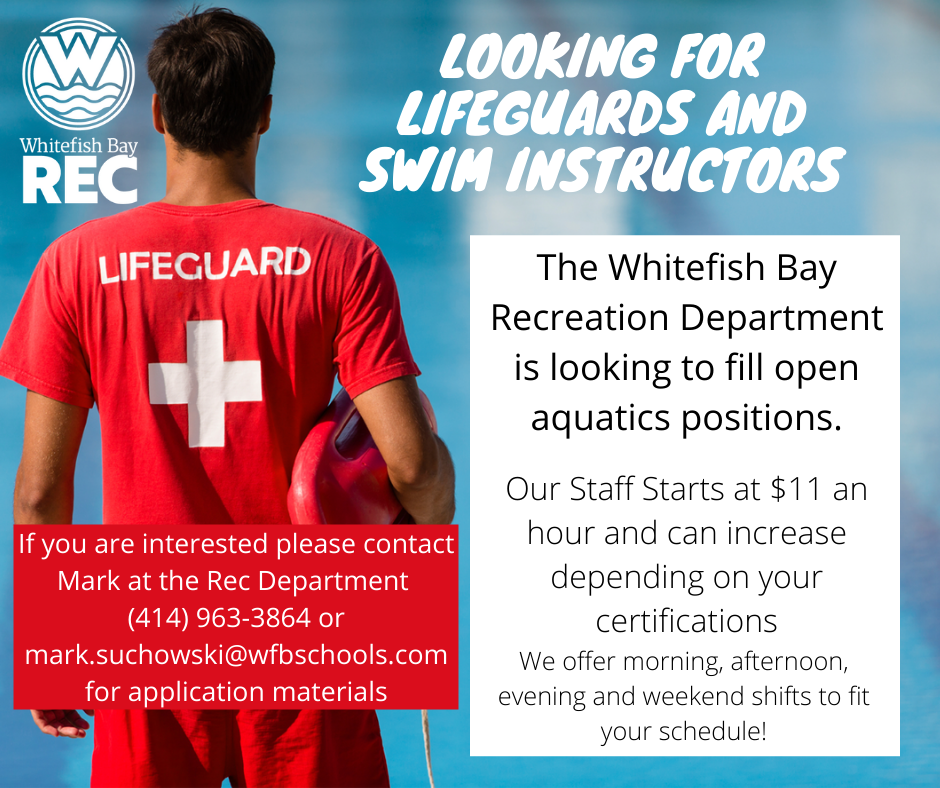 The Whitefish Bay Recreation Department is looking for lifeguards and swim instructors for 2022. Pay starts at $11.00/hour with flexible schedules.