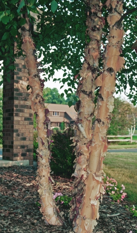 River Birch-grows along streams and rivers and is fast growing. Excellent bark interest that looks like it flakes. Constantly leaves small leaf debris, so plant away from any structures, as all of this can be tracked into a building.