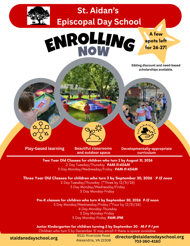 Just a reminder that St. Aidan's follows the Fairfax County Public Schools inclement weather policy. When FCPS is closed, the church is closed and all in person activities are cancelled or postponed.