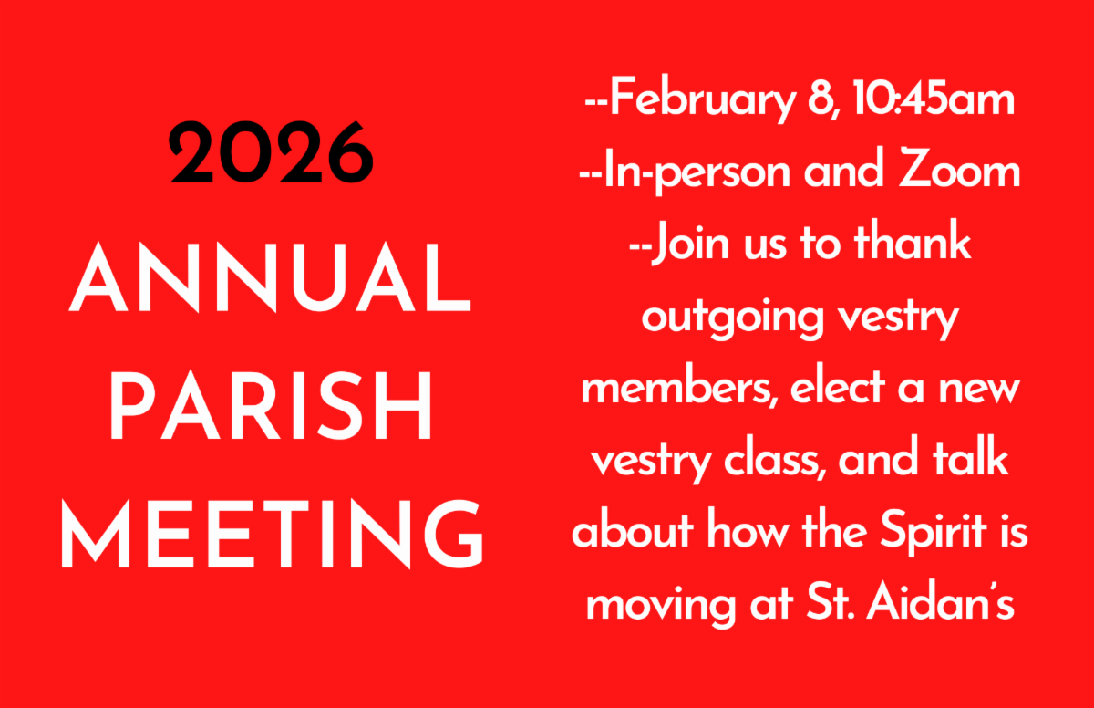 | | | Please plan to attend the Annual Parish Meeting. Each year, the parish gathers both to do the business of the church and check in with one another. We will thank outgoing vestry members who have served generously, elect three new vestry members, and hear about “the State of St. Aidan’s”-or how the Spirit continues to move in our community. A quorum is required to elect new vestry members, and a zoom link and materials for the meeting will be sent out electronically prior to the meeting. | | |