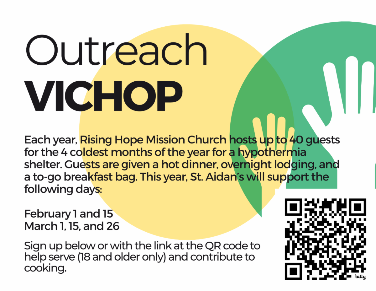 Each year, Rising Hope Mission Church hosts a hypothermia shelter during the four coldest months of the year. A warm dinner, overnight lodging, and a to-go breakfast bag is provided for up to 40 guests at Rising Hope. You can help by cooking the meals during First Sunday Outreach, assembling the breakfast bags, serving on the Sunday evenings (18 and over only), or helping with overnight.
