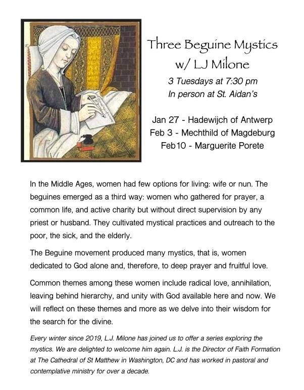 7:00 pm via zoom. If you are interested in this shared prayer practice, email Eileen Myers at staidansalexandria@gmail.com to receive