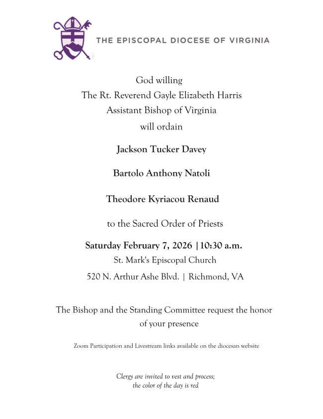 Please join Ted Renaud at his Ordination in Richmond on Saturday, February 7, 2026 at 10:30 a.m. It will take place at St. Mark's Episcopal Church, 520 N Arthur Ashe Blvd. Richmond, Va.