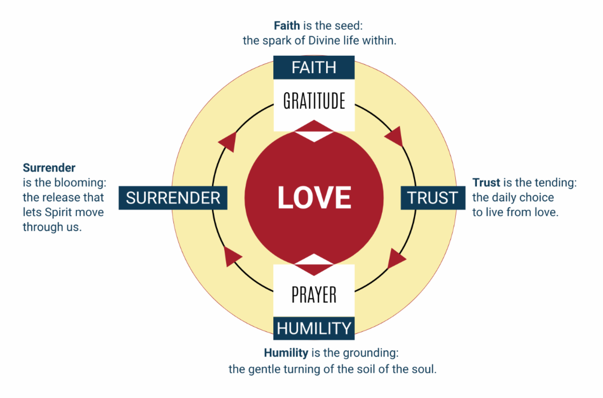 P.S., Once again, I'm sharing a graphic that helps me focus on aspects of faith each day as I practice living into a sacred cycle of faith born of trust, humility, and surrender. As we live, our faith and become more grounded in Divine love; it can be fed by both gratitude and prayer. I invite you to use this image if it's helpful. Make notes, journal about it, and let me know what comes up in your heart and mind.