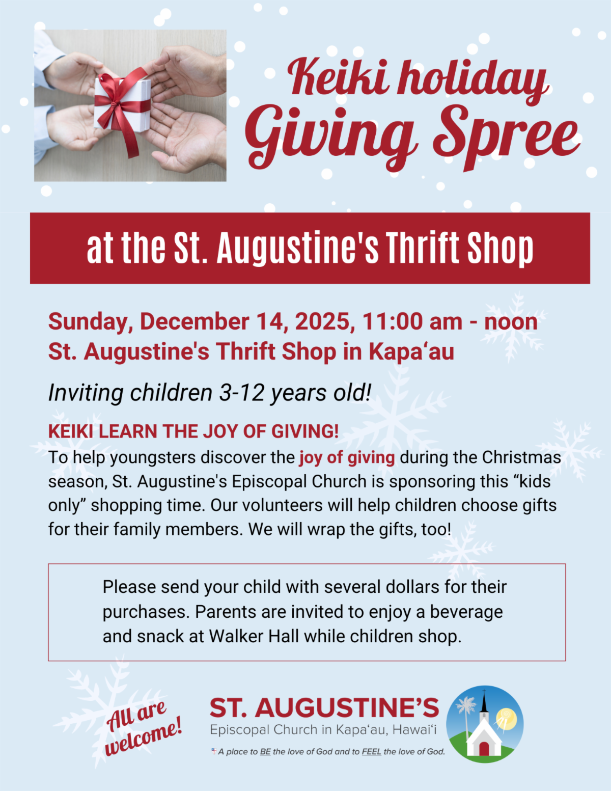 Join the fun and serve our community by volunteering at our Thrift Shop. Please spread the word! Folks can contact admin@staugustineskohala.com