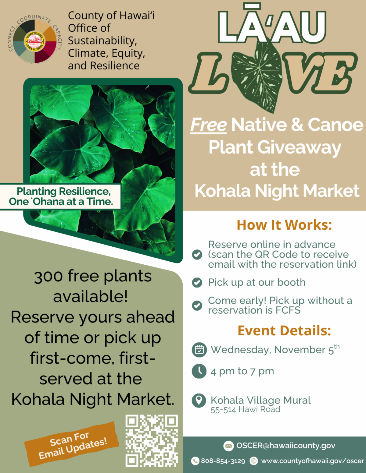 Addressing food insecurity through food preservation education; alleviating hunger by sponsoring the Little Free Pantry and partnerships to assist Kohala Cares, the Kohala Food Hub, and the North Kohala Community Resource Center & Resilience Hub.