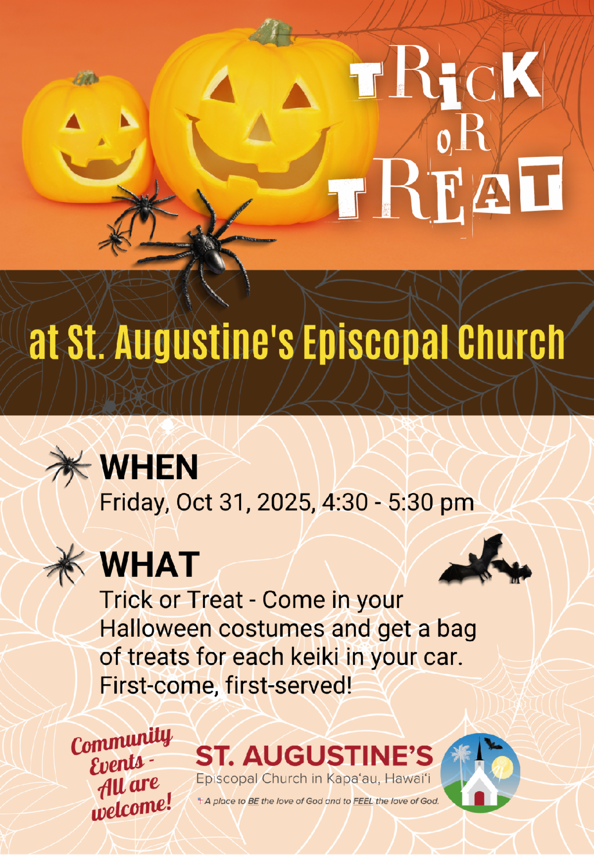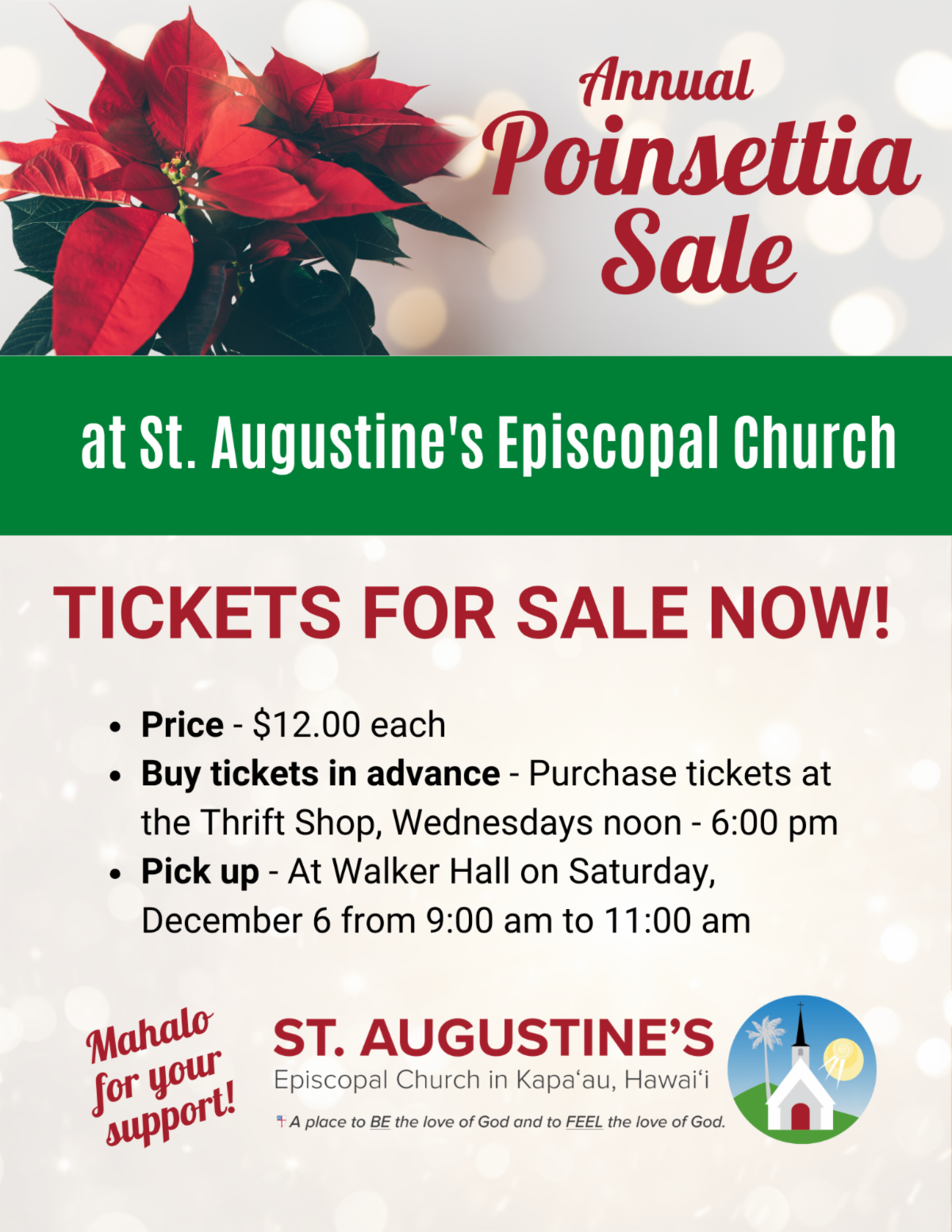 If you have information to share, please let us know! This newsletter helps us stay in touch in a variety of ways, such as news, requests for prayers, offers of assistance, or information on garden bounty (fruits, veggies) you would like to share. VicarJennifer@staugustineskohala.com or admin@staugustineskohala.com Submissions due by Thursday morning for Friday's newsletter. | |