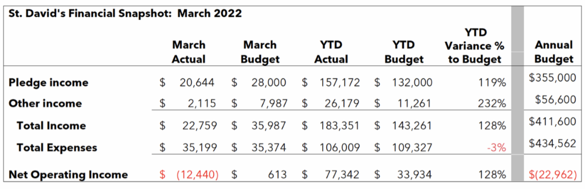 March Pledge Income was somewhat less than planned but this can be attributed to a significant pre-payment of pledges in January and February. Income for the first Quarter is higher than planned. Year-to-Date Expenses continue to run lower than planned and Net Income for first Quarter is significantly higher than planned.