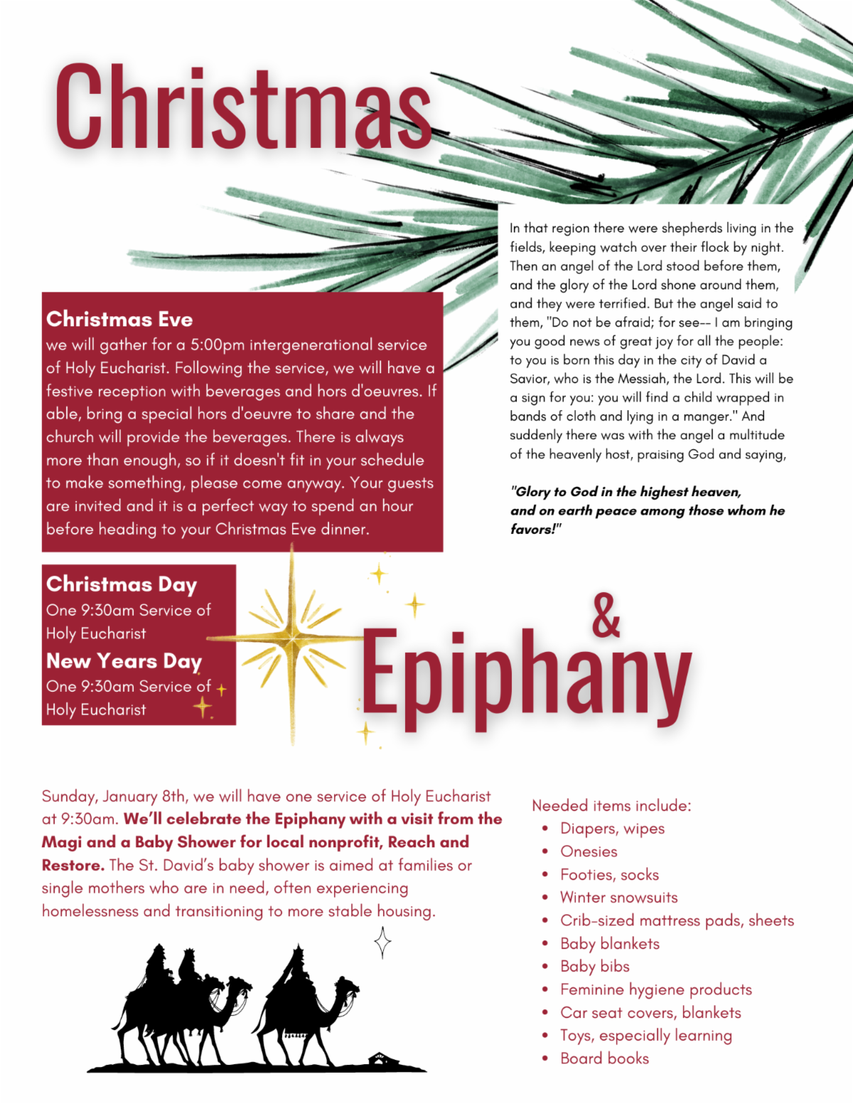 - One 9:30 service of Holy Eucharist with a special visit from the Magi and the Rt. Rev. Craig Loya!