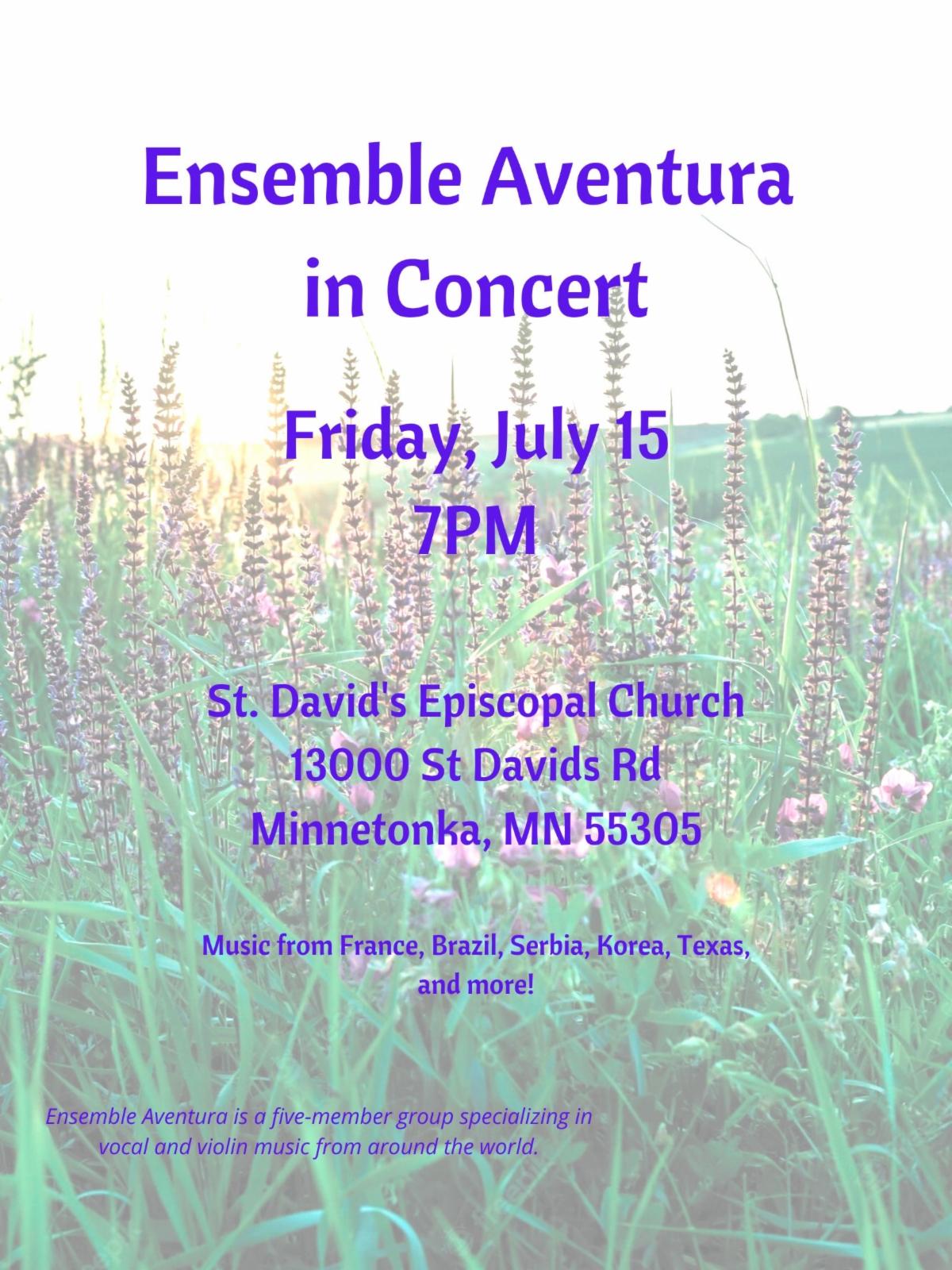 Join Roger and Monica Stratton with their global jazz group, Ensemble Aventura, for a free concert at St. David’s tomorrow, July 15 at 7pm.