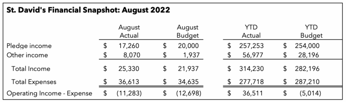 Monthly Pledge Income has been somewhat less than planned from March through August. This can be attributed to a significant early payment of pledges in January and February. Year-to-Date, Pledge Income is slightly higher than planned; but to attain our year-end pledge income goal of $355,000, we need to receive nearly $25,000 per month from September through December. If you are behind on your pledge, please make a plan to catch up before year-end.