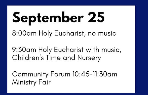 We will be continuing Kick-Off Month this Sunday with a Ministry Fair after the 9:30 Service. Please join us to learn more about St. David's many ministries through stories. Consider the indicators of discernment (joy, energy, persistence, convergence, fruit-fullness, and God's Peace) that we learned about in last week's World Cafe as you reflect on what ministries you might want to get involved in this year. (And come, even if you missed last week's session!). We will be handing out Program Guides and Ministry Sign-Up cards that you will be able invited to fill out and turn in on Sunday October 2nd.