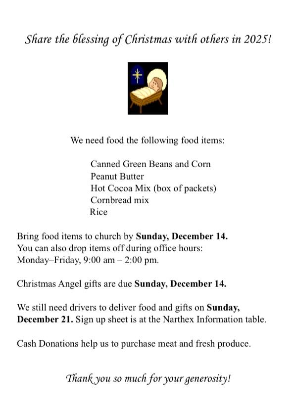 We still need 10-12 more volunteers to deliver Christmas boxes after church on December 21. There is a sign-up sheet in the Information Center. If you have any questions, feel free to contact Barbara Bridge or Carole Biskar.