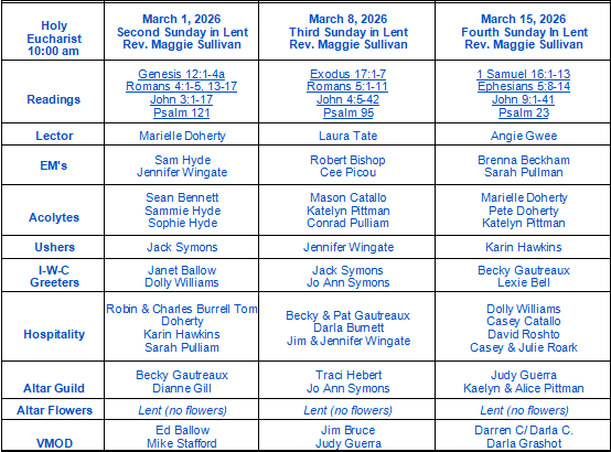 A list of the Ministers of the Liturgy for March 1 - March 15, 2026