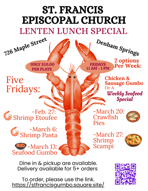 Fri Feb 27 -- Lenten Lunches begin! Order ahead by phone, QR Code or click here-- Chicken and Sausage Gumbo and Shrimp Étouffée