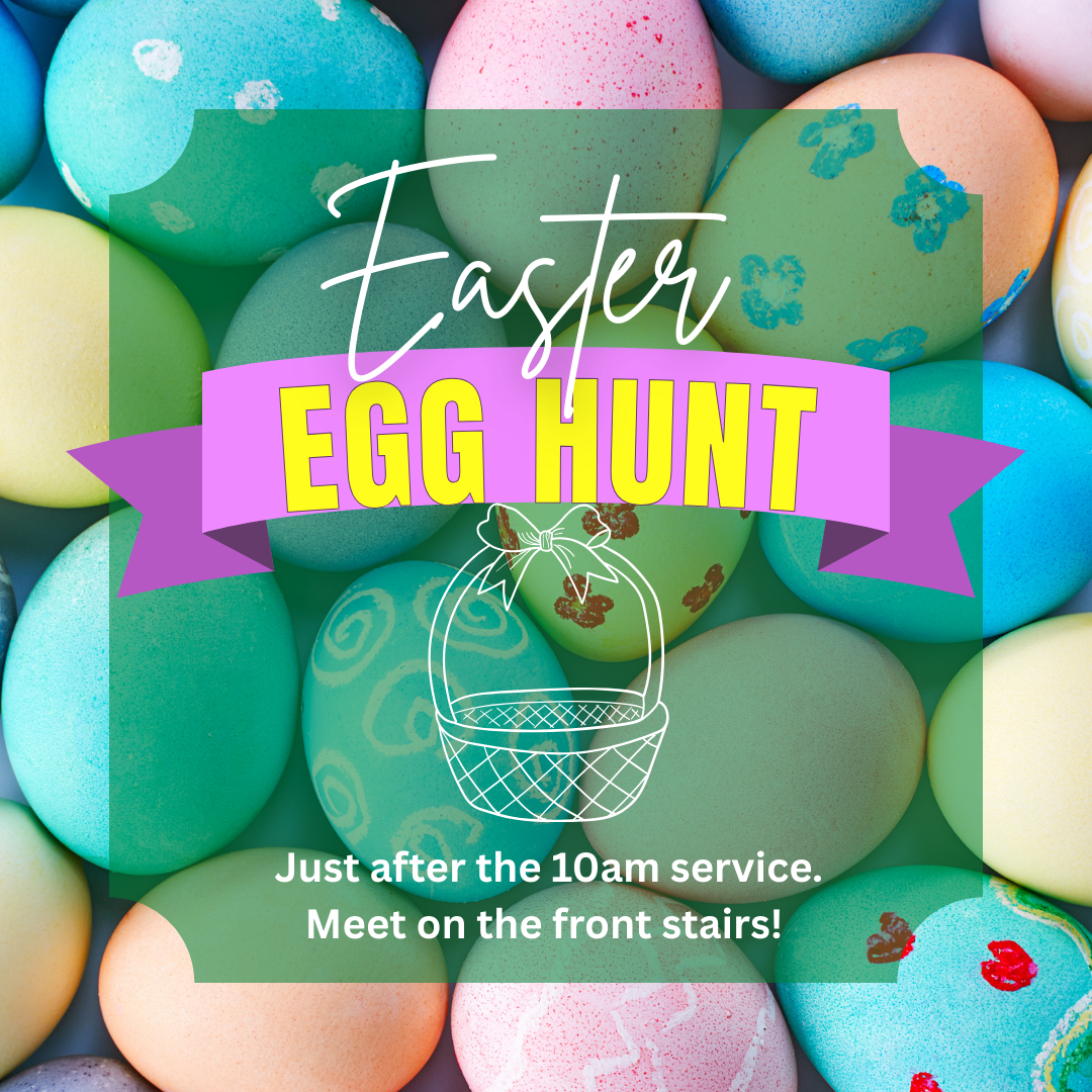 Easter Sunday will have its usual joys, and we may just have a surprise or two for you. We hope you will help us pack the church for our celebrations. 8 am is outside in our Memorial Garden, and the 10 am is in the Church. The Egg Hunt will be after the conclusion of the 10 am service.