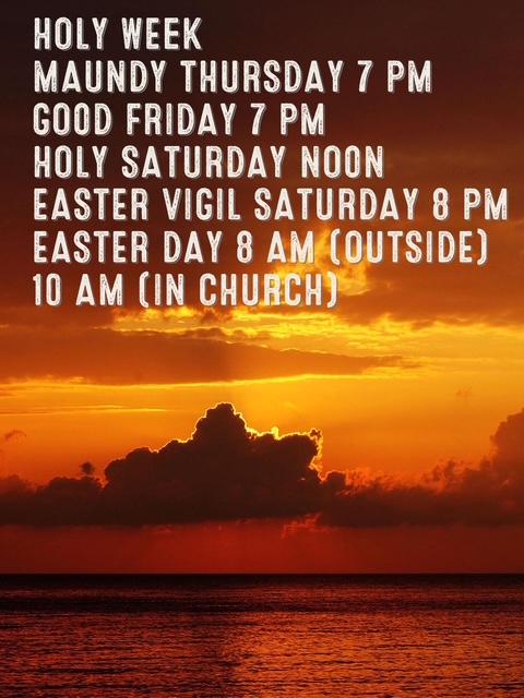 - 4/19- Noon-Holy Saturday Service; 8pm Easter Vigil