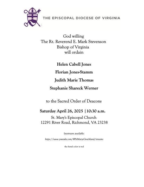 - 4/26- Deacon Ordination 1030AM at St Mary's Episcopal Church in Goochland, VA (including our own Stephanie Werner)