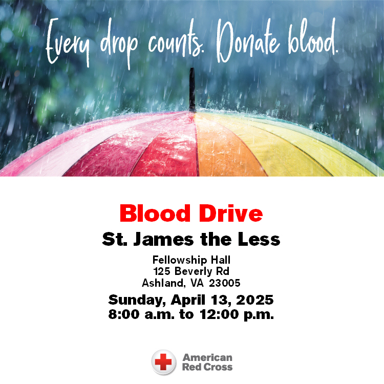 This Sunday, if you are able, we encourage you to give during our Blood Drive. There are plenty of spots available, and we encourage you to help out. Also, please invite your friends if you know they are donors. This will be in our Parish Hall and they can enter that door while services are happening. We hope to have many more spots filled if you can help us out.
