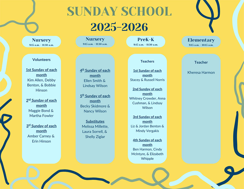Teachers: You may also view the Sunday School and Nursery roster above or click here for a PDF to save.
