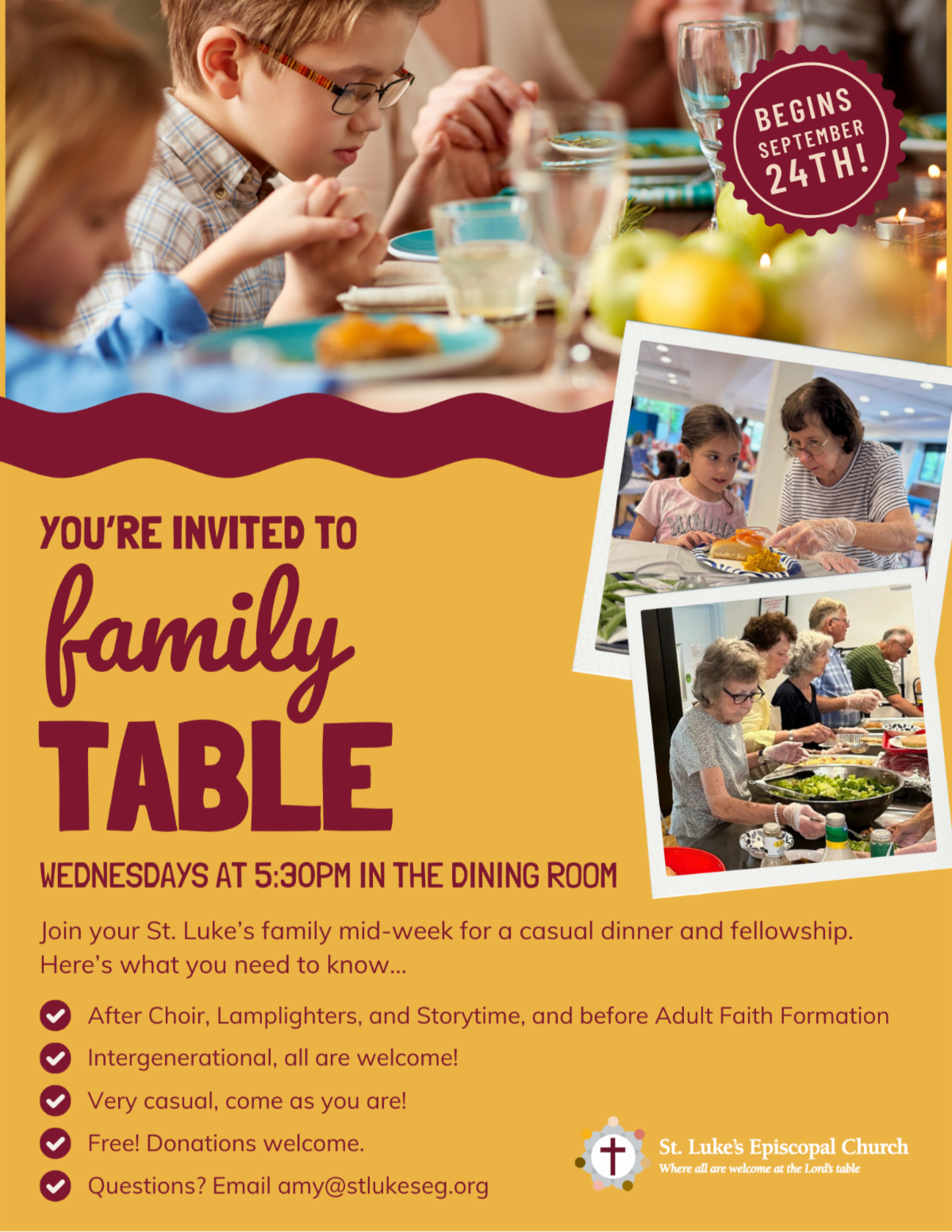 EXCITING NEWS! We have introduced a new program after Lamplighters and Storytime and before Adult Faith Formation called Family Table. It is held every Wednesday at 5:30PM in the dining room. Please join us for a super casual intergenerational dinner open to the entire congregation with a goal of providing fellowship and building community. Our next dinner will be on Wednesday, October 1st--see more below!