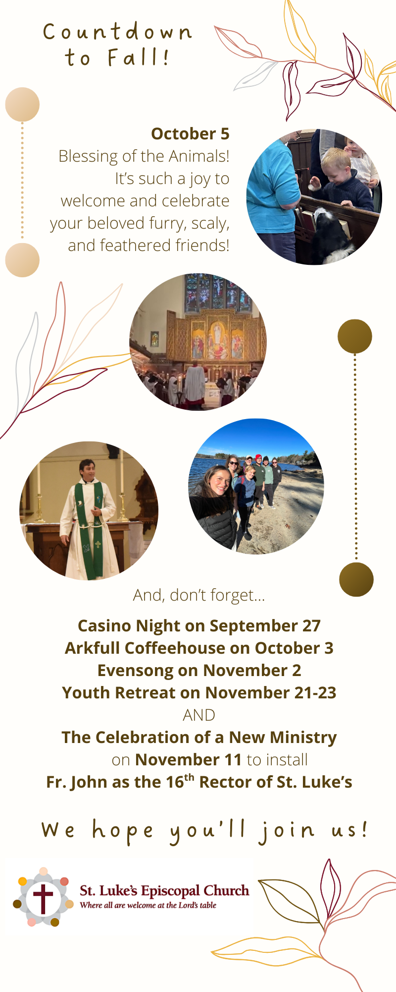 Children aged 10 and up are warmly invited to serve, and we’ve now opened the ministry to adults as well. It would bring great joy to see acolytes once again carrying the cross and flanked by torchbearers at the 10 AM service.