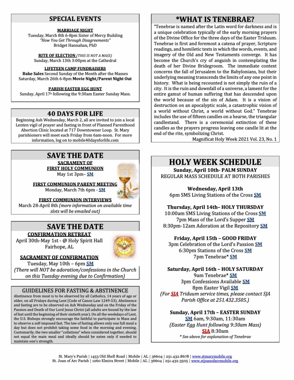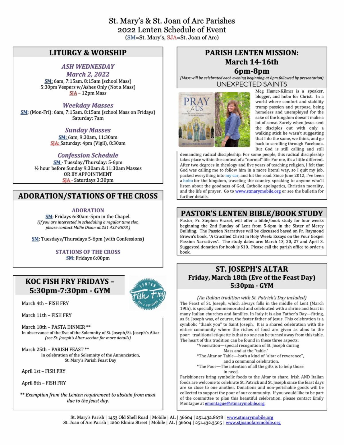 If you have a local restaurant and would like to be added to this Sunday Bulletin Patron list, please contact Marcelle Naman at mrnaman@stmarymobile.org