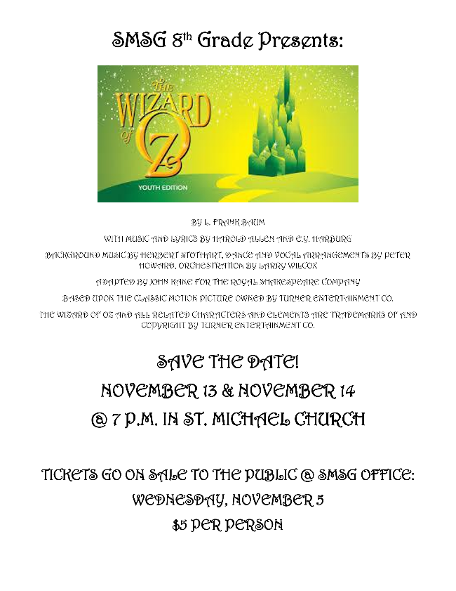 Finally, we hope that everyone will support our 8th grade students as they present the musical The Wizard of Oz on Thursday, November 13th, and Friday, November 14th. The show begins each night at 7:00 p.m., and tickets may be purchased through the main office of the school for $5 a piece.