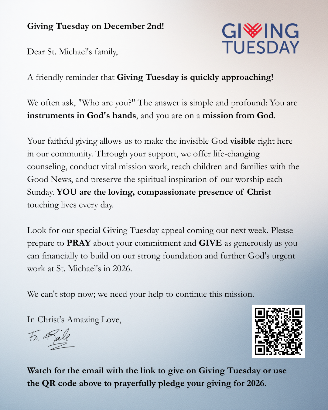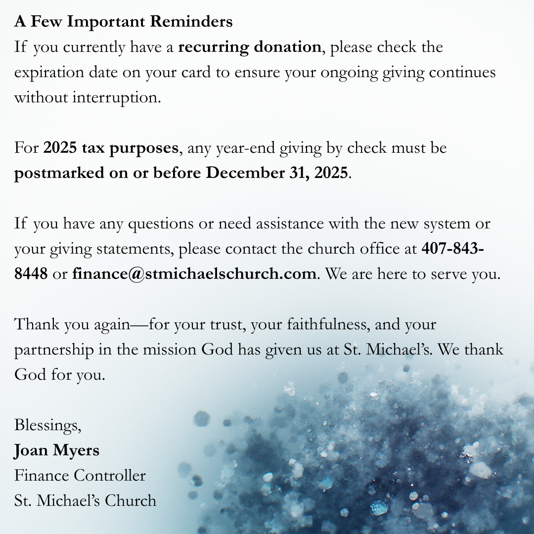 As you gather with family, friends, or perhaps in a quieter space this year, I pray you will feel the deep, steady joy of being held by God’s love. And I pray you know how deeply cherished you are by your St. Michael’s family.