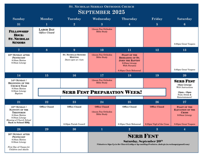 The Blessing of the Church School will occur during the Liturgy on Sunday, September 21st, the Feast of the Nativity of the Most Holy Theotokos. After Liturgy, we will have our annual Church School BBQ and games.