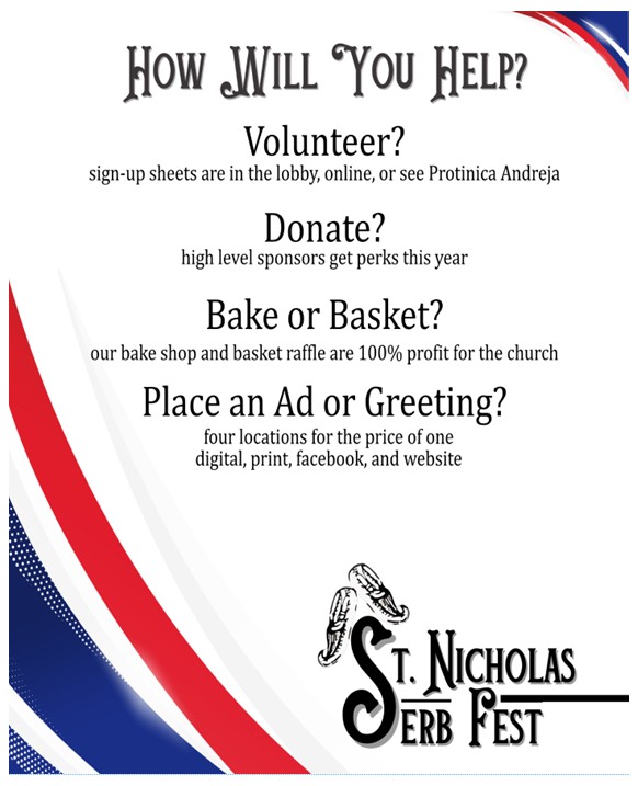 A generous donor has given us a gift of surplus food, which includes brand name frozen pizza!! PLEASE visit the table in the Social Hall and take what items you or someone you know can use. Then make a Monetary Donation of what you can. Help someone in need and Save money at the same time! Remember to check the table every time you are at church as supplies will change frequently. ALL monetary donations will go to support our St. Sava Shadeland Camp!!! See Terry Govelovich to purchase the frozen pizzas.