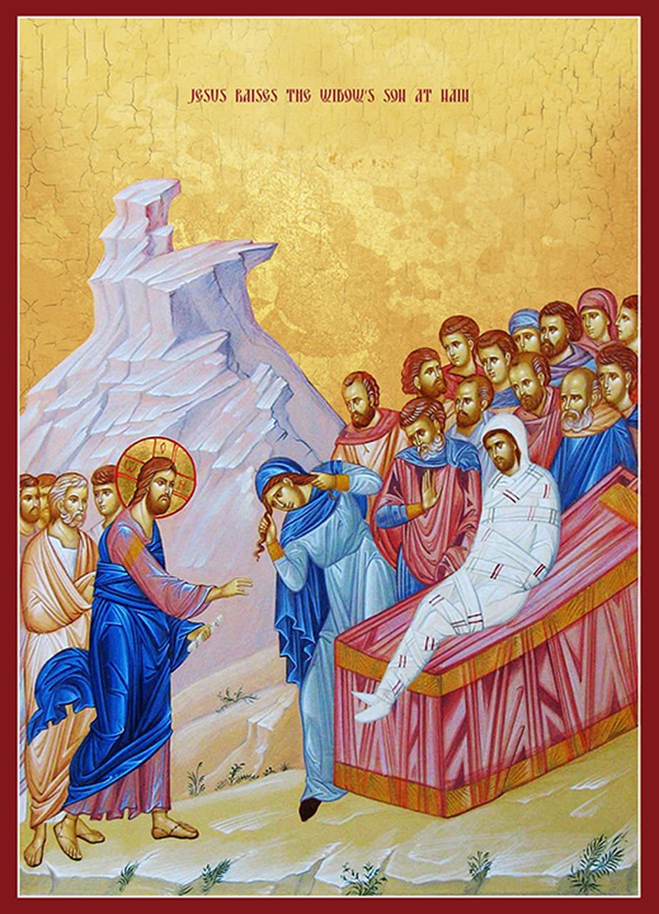 У вријеме оно, Исус иђаше у град који се зове Наин, и с њим иђаху многи ученици његови и мноштво народа. А када се приближи вратима града, и гле, изношаху мртваца, јединца сина матере његове, и она бјеше удовица; и многи народ из града иђаше са њом. И видјевши је Господ сажали се на њу, и рече јој: Не плачи! И приступивши дохвати се носила, а носиоци стадоше; и рече: Момче, теби говорим, устани! И сједе мртвац и стаде говорити; и даде га матери његовој. А страх обузе све, и слављаху Бога говорећи: Велики пророк подиже се међу нама, и Бог походи народ свој.